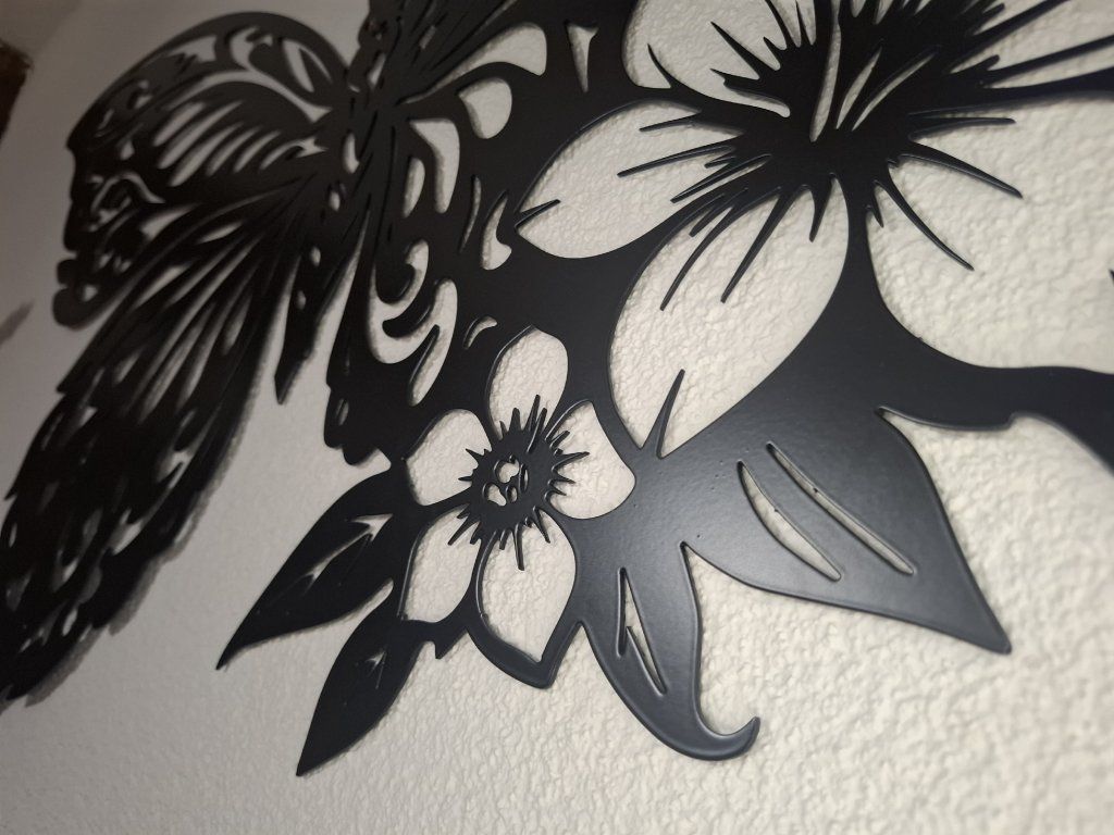 Precízne vyrezávané krídla s ornamentálnymi líniami vytvárajú zaujímavú hru svetla a tieňa na stene. Kompozíciu dopĺňajú kvety, ktoré dodávajú celému obrazu prirodzenú harmóniu a jemný dekoratívny charakter. Vďaka tomu obraz nepôsobí len ako dekorácia – stáva sa dizajnovým prvkom priestoru.